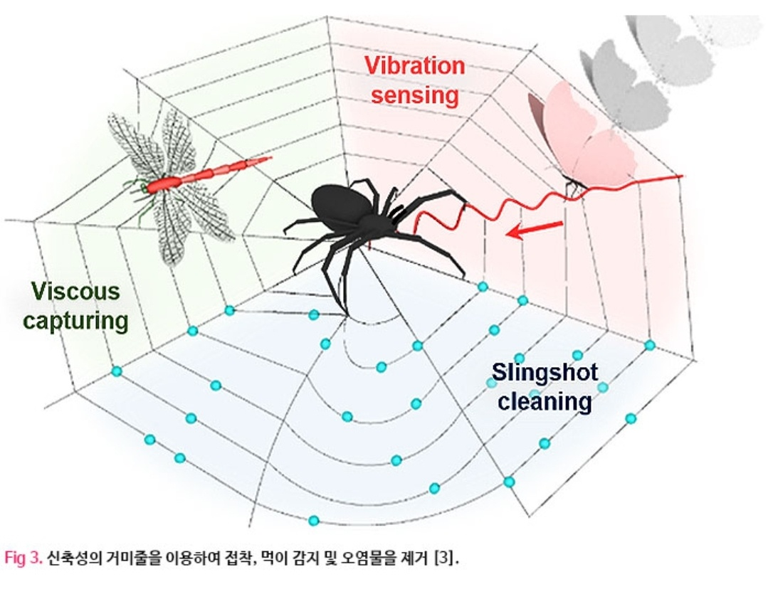 또한 거미는 새총을 쏘듯 거미줄울 잡아당겼다 놓는 방식으로 거미줄에 붙어있는 오염물을 날려버린다. 관성력을 이용하는 것이다. 이를 통해 오염된 거미줄의 포획능력을 원래의 상태로 회복 시킬 수 있다. 이렇게 거미줄은 그 자체만으로 먹이 사냥을 위해 접착, 센싱, 액츄에이팅의 세 가지 기능을 구현하기 위해 사용된다.