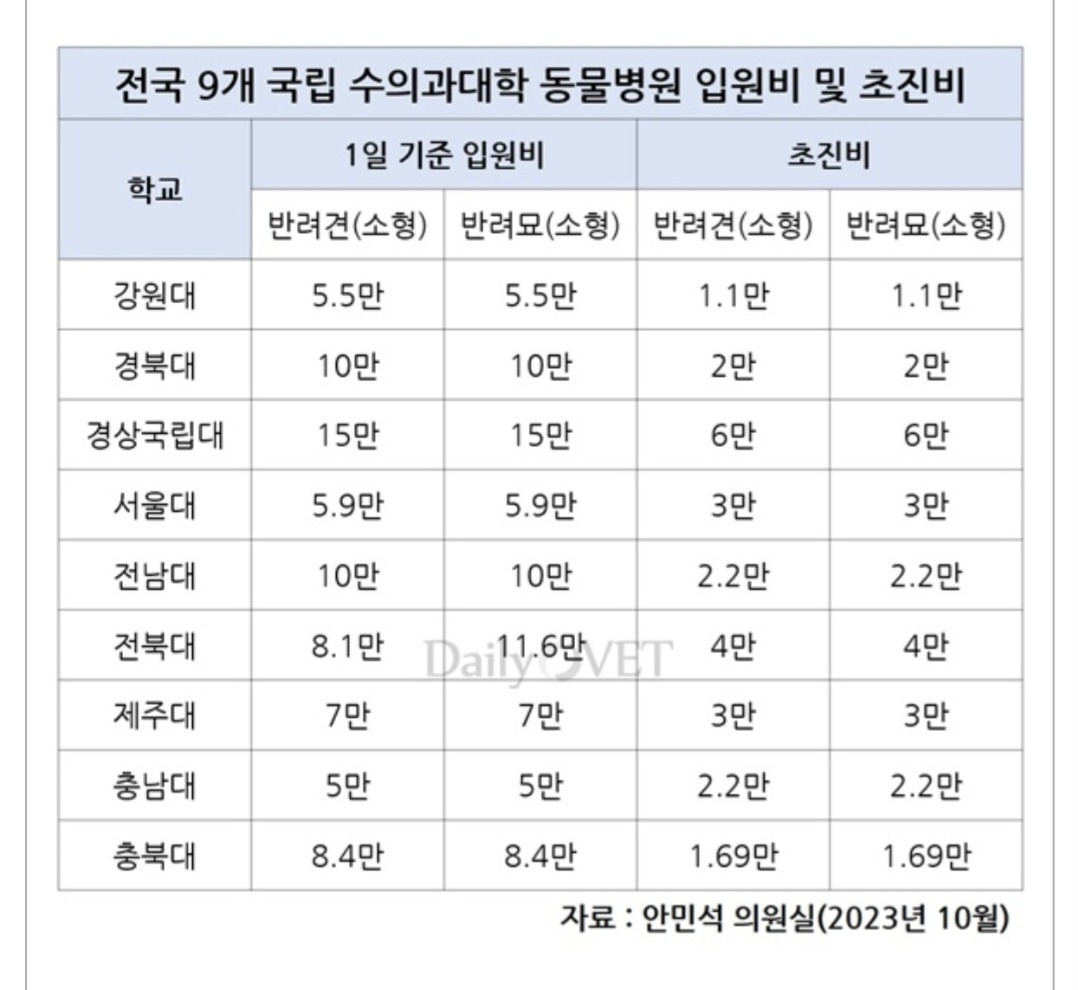 원문 출처: 안민석의원 "전국 9개 국립 수의대 동물병원 초진비 최대 5배 차이" / 이학범기자 / Dailyvet / 2023-10-04