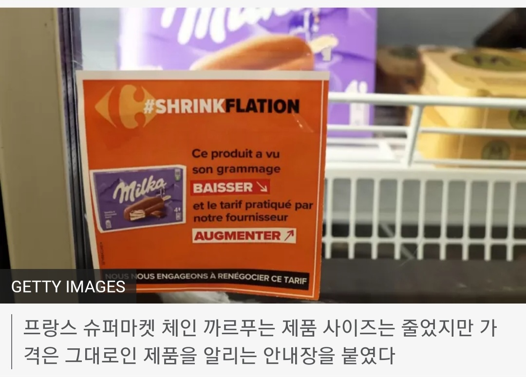 프랑스 대형마트 카르푸 매장에는 최근'#슈링크플레이션' 문구를 단 진열대가 등장했다. 가격은 그대로지만 용량을 줄인 제품을 따로 모아 안내한다. 원가 상승을 빌미로 소비자에게 부담을 전가한 기업에 가격을 낮추라는 취지에서다. 1)