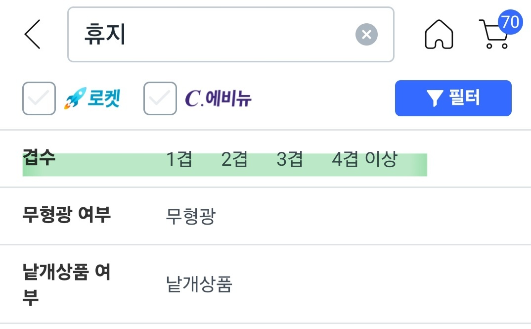쇼핑몰에서 휴지 검색시 겹 수는 필터 지정이 가능합니다.